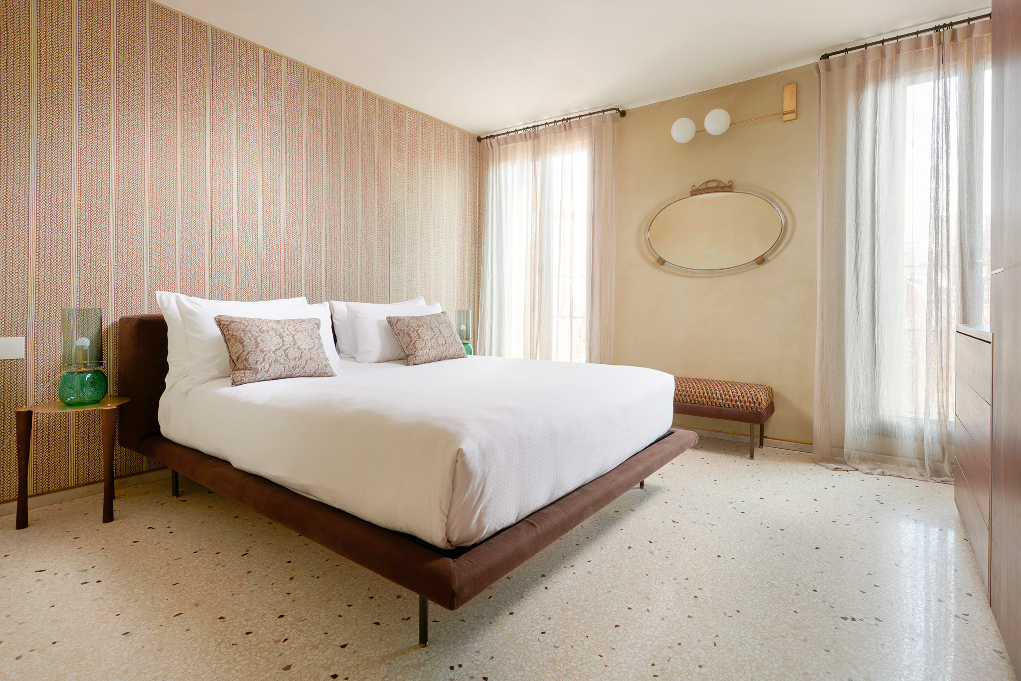 Le forme di divani, letti e poltrone reinterpretano le silhouette delle facciate dei palazzi, delle iconiche scarpe patrizie del Cinquecento e dei tessuti preziosi realizzati su misura, alcuni dei quali ispirati ai mosaici della Basilica di San Marco. Il tutto in un’eleganza sobria e sofisticata, tipicamente veneziana.
