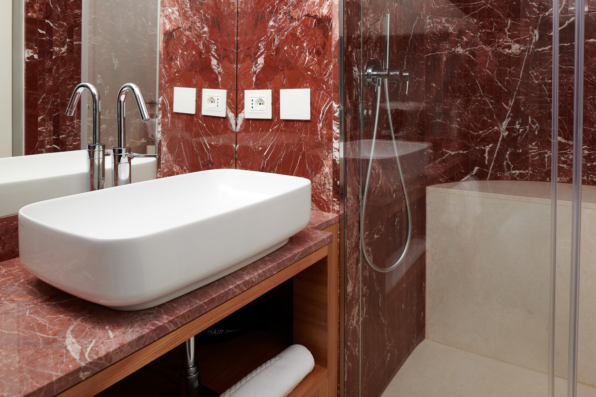 Progettato dal celebre designer veneziano Umberto Branchini, il palazzo fonde la tradizione veneziana con un’eleganza contemporanea unica. L’uso sapiente del colore e di materiali pregiati – dal marmorino al pastellone, fino ai raffinati marmi dei bagni – è al massimo livello. Oggetti d’arte, mobili d’epoca e lampade selezionate con cura contribuiscono a creare l’atmosfera rarefatta e autentica di una vera casa veneziana.
