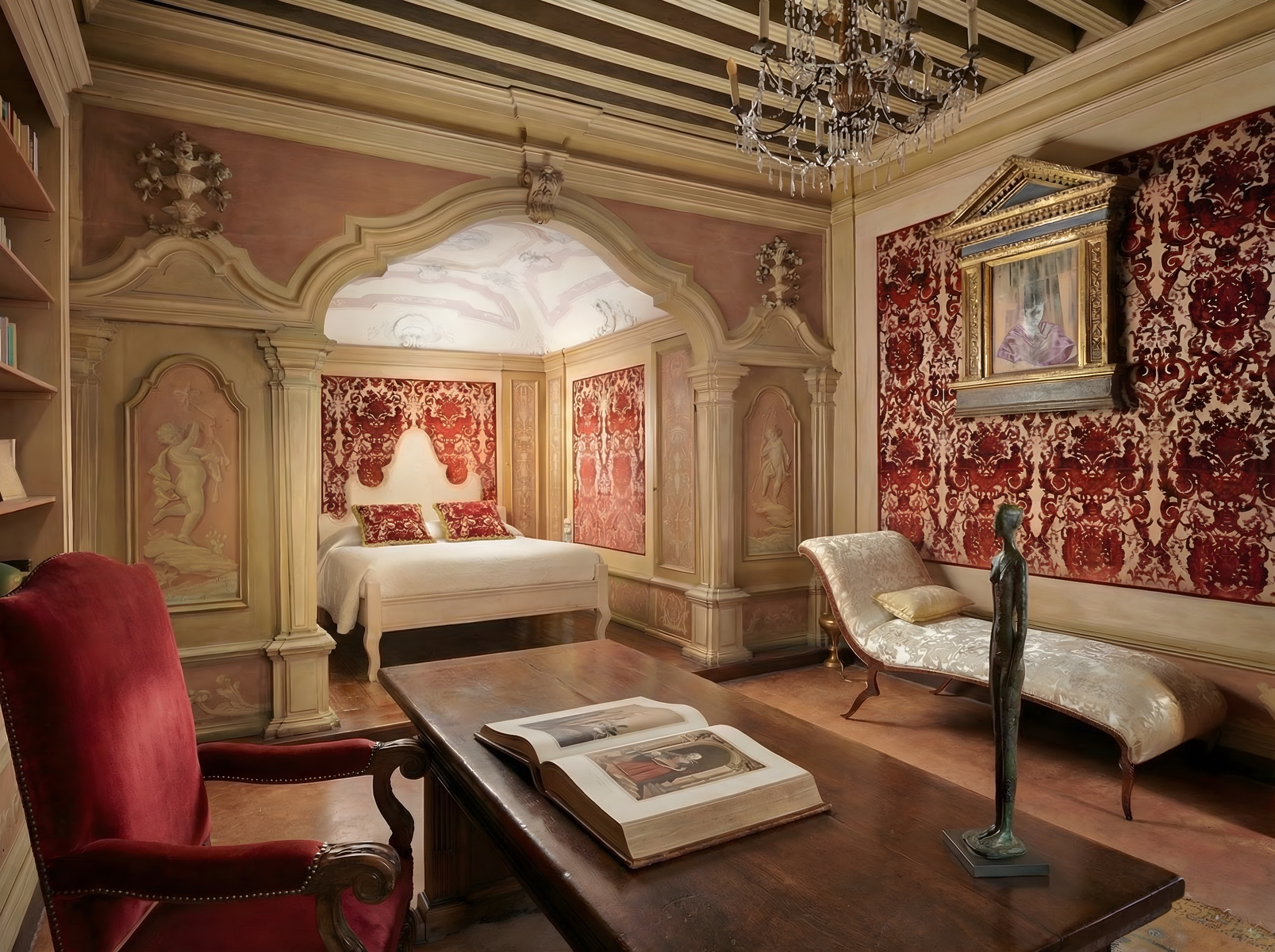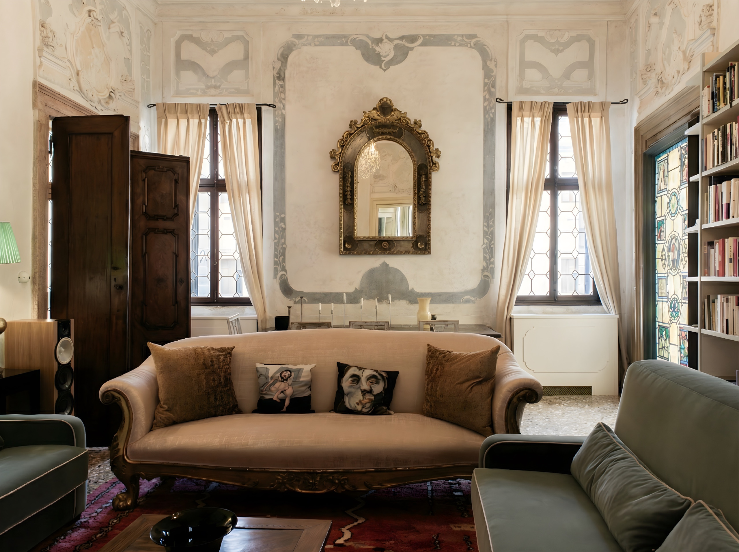 The interiors feature an elegant and curated mix of antique and contemporary furnishings, with Murano, French and Italian chandeliers and mirrors, paired with bespoke draperies crafted by the iconic Venetian textile house Rubelli. The result is an atmosphere that feels both timeless and effortlessly refined.