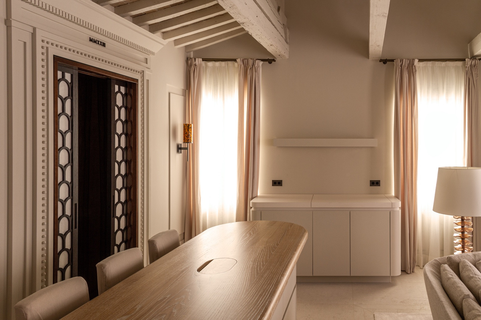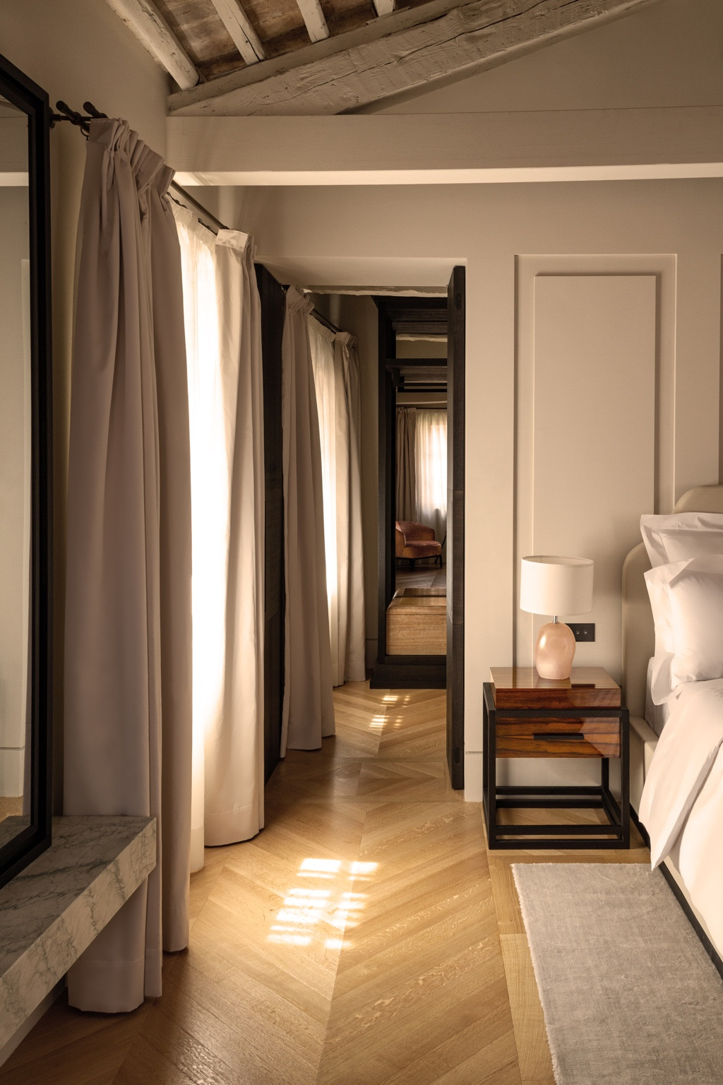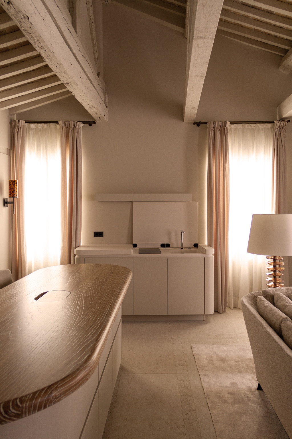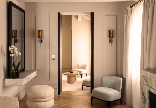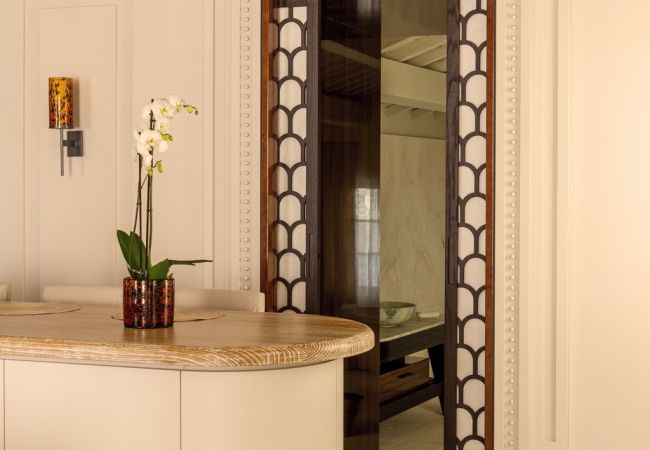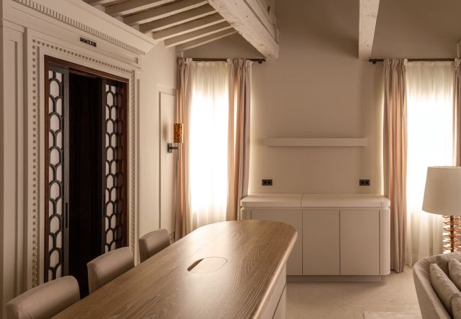 TSuite VIII is an elegant and thoughtfully designed one-bedroom apartment located on the second floor, spanning 980 sq. ft. (91 m²). It features a spacious double bedroom with a walk-in closet and private WC, a luxurious bathroom with a bathtub and separate shower, and a state-of-the-art kitchen flowing into a stylish living room. With private elevator access and beautiful architectural details, Suite VIII offers a luxurious and contemporary take on traditional Venetian living in the heart of San Marco.