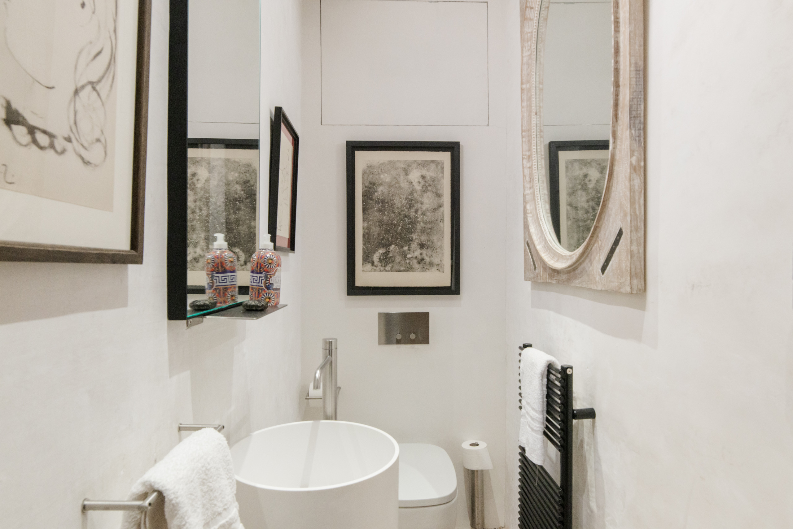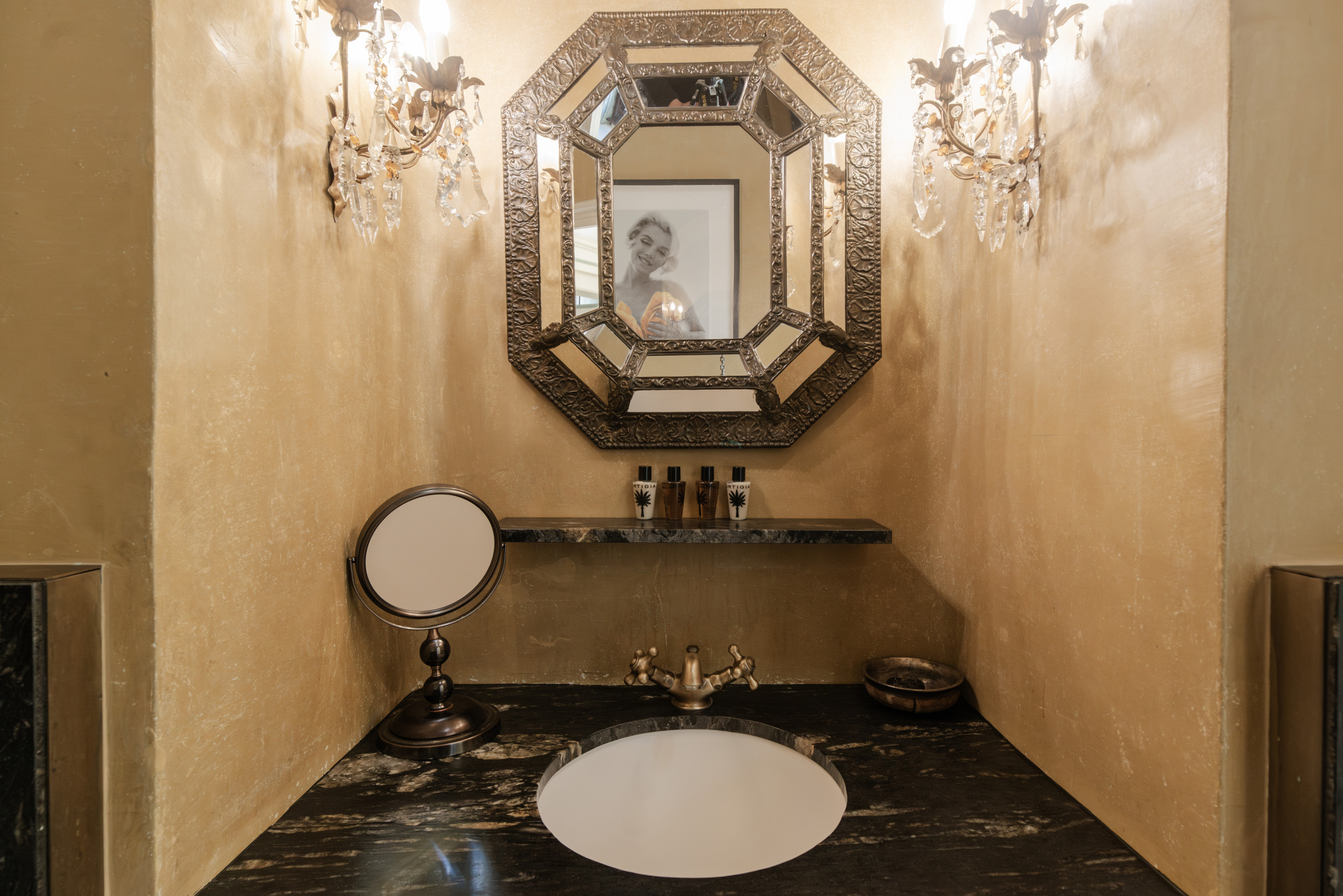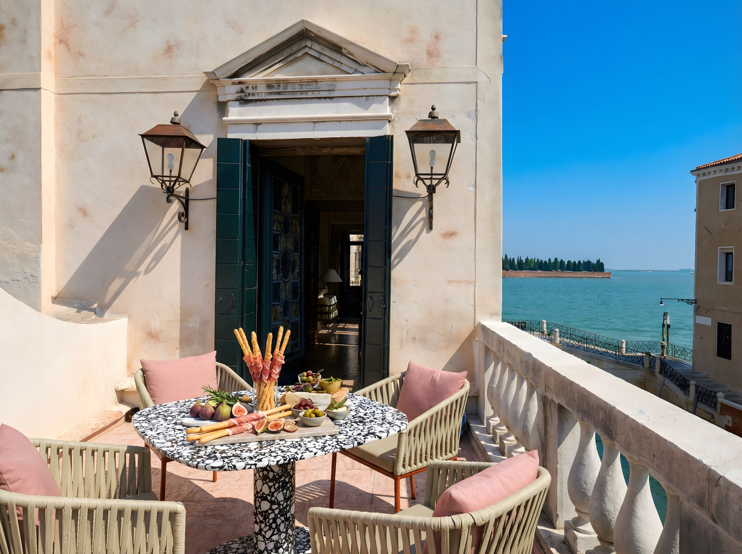 Les intérieurs présentent un mélange élégant et soigné de meubles anciens et contemporains, avec des lustres et des miroirs de Murano, français et italiens, associés à des draperies sur mesure réalisées par la maison textile vénitienne emblématique Rubelli. Le résultat est une atmosphère à la fois intemporelle et naturellement raffinée.