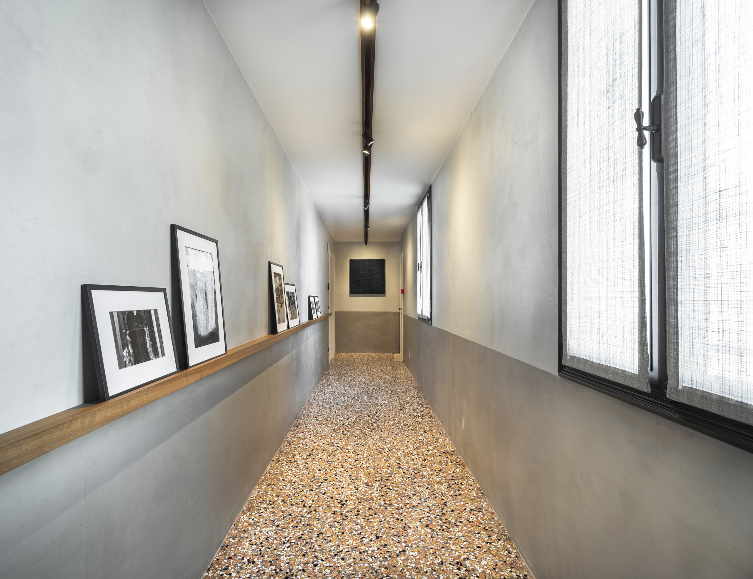 Les intérieurs, riches de caractère, présentent des œuvres d'art soignées, des sols en terrazzo, des marbres et des lustres élégants de Murano, créant une atmosphère sophistiquée mais accueillante.