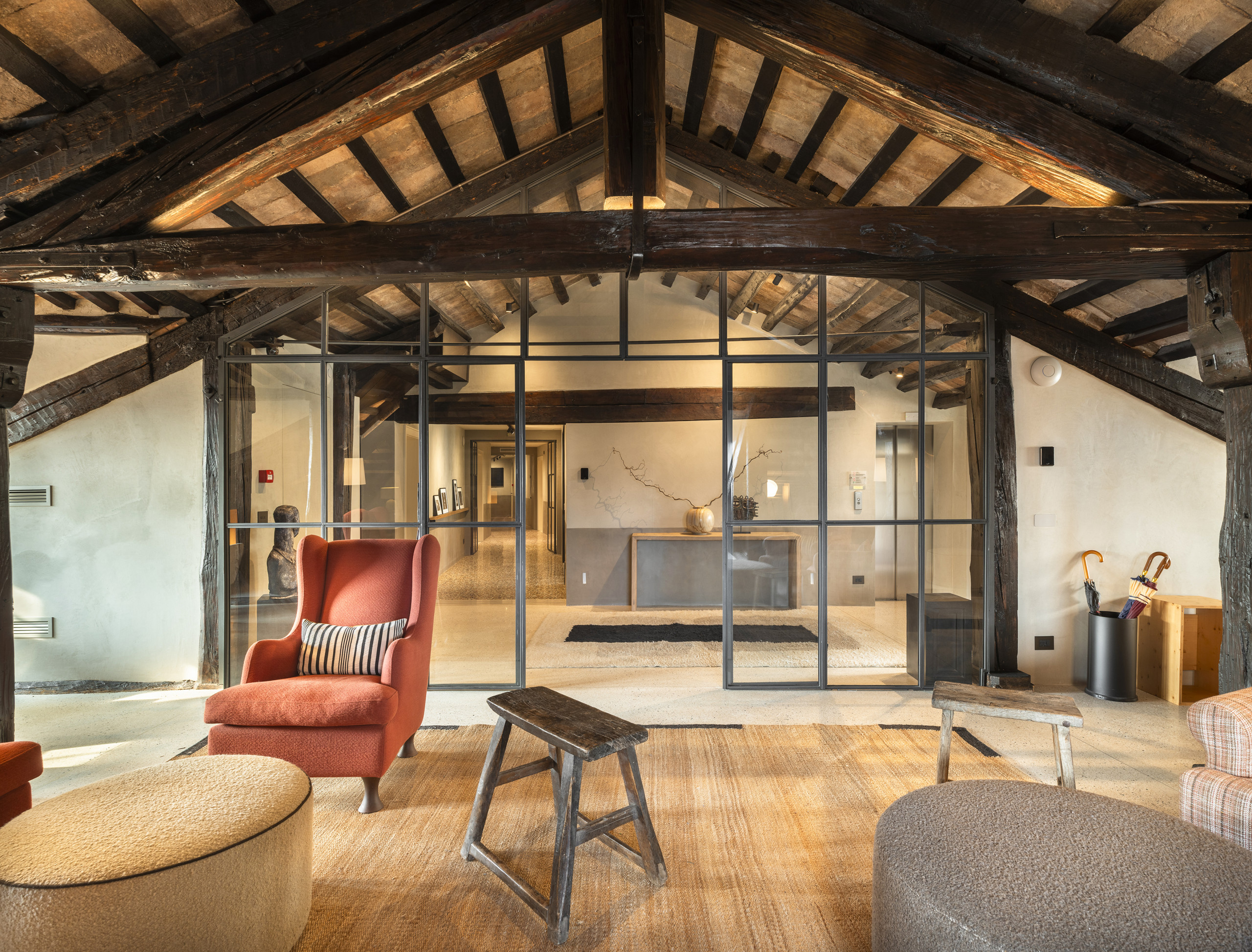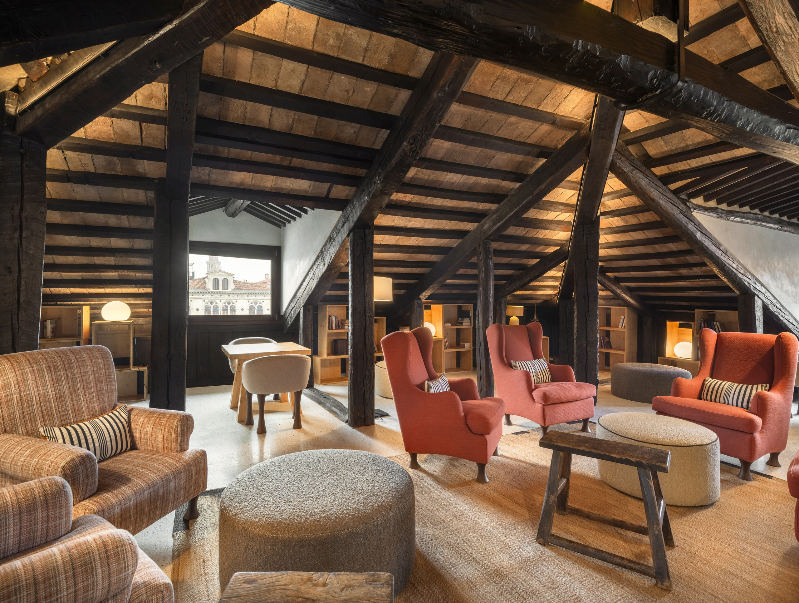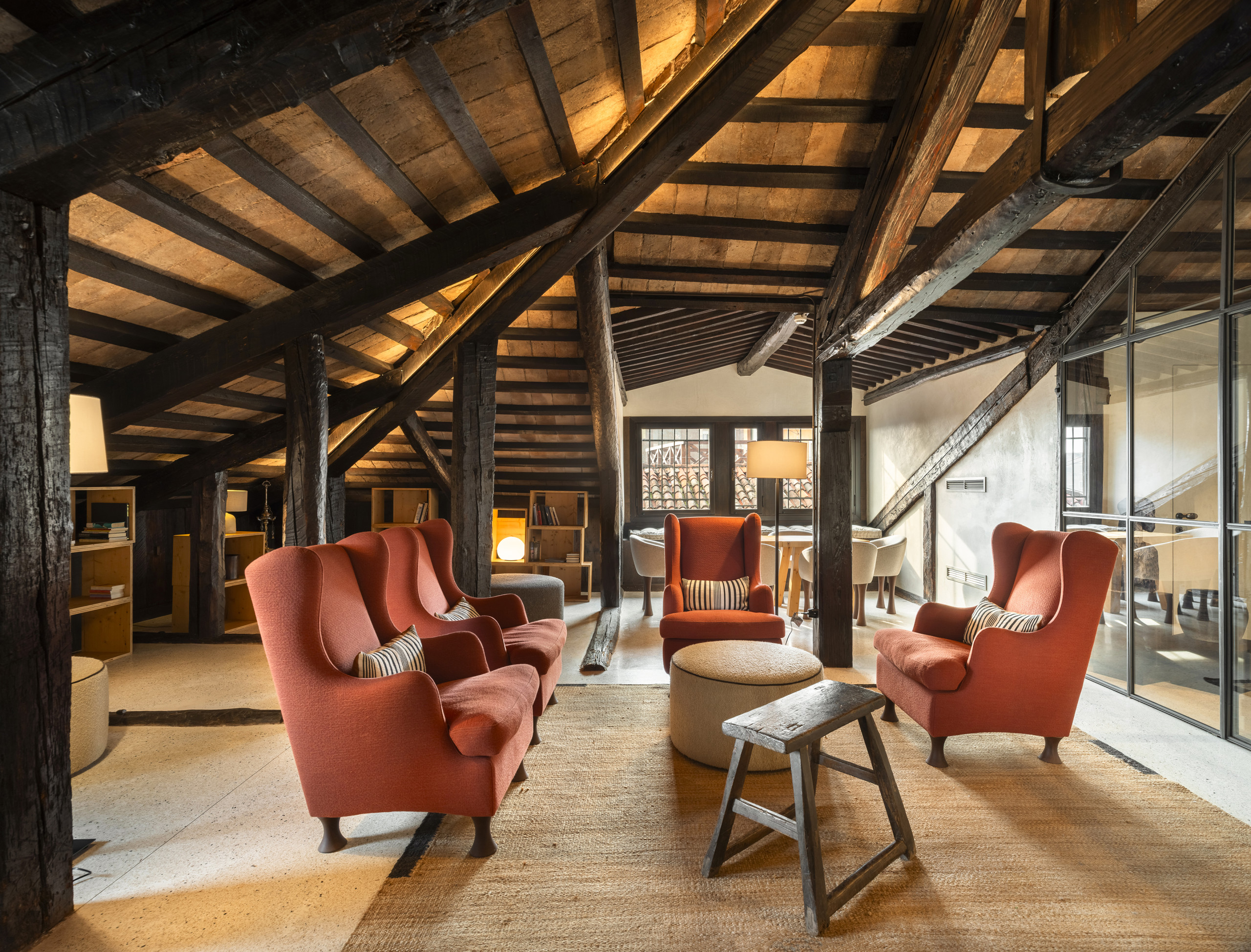 Chaque suite est équipée de Wi-Fi, de la climatisation, de la télévision et d'accessoires de salle de bain de qualité. Dans les espaces communs, on trouve une grande salle de lecture et de détente avec des poutres en bois du XVIIe siècle et une grande fenêtre panoramique : un environnement accueillant avec des fauteuils confortables, des tables de design et des sièges rembourrés, idéal pour déjeuner, écrire ou simplement se détendre.