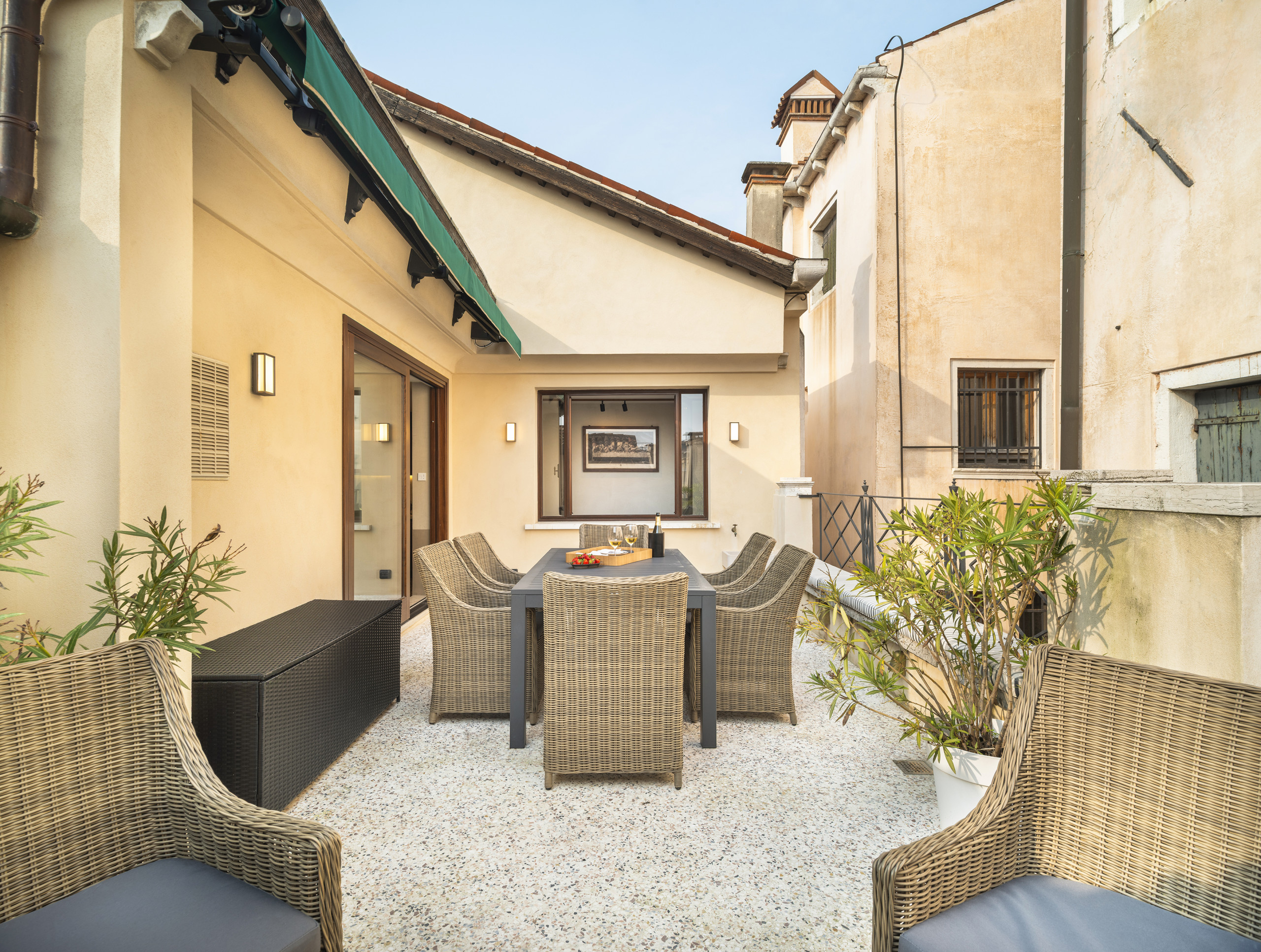Au dernier étage se trouve une zone bar ouverte à tous les invités, avec une terrasse aménagée et une vue spectaculaire sur le tronçon le plus fascinant du Grand Canal