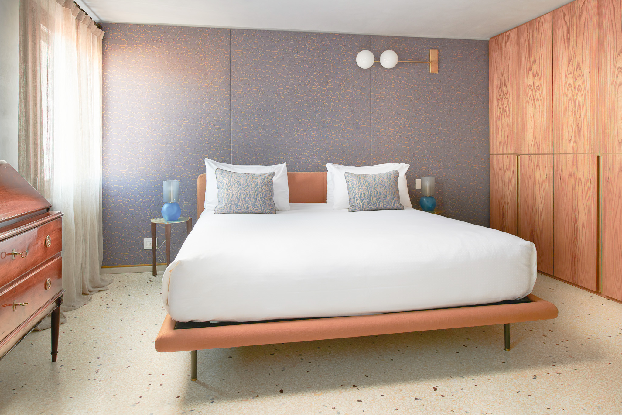 Des tissus Fortuny riches et des ameublements raffinés créent une ambiance